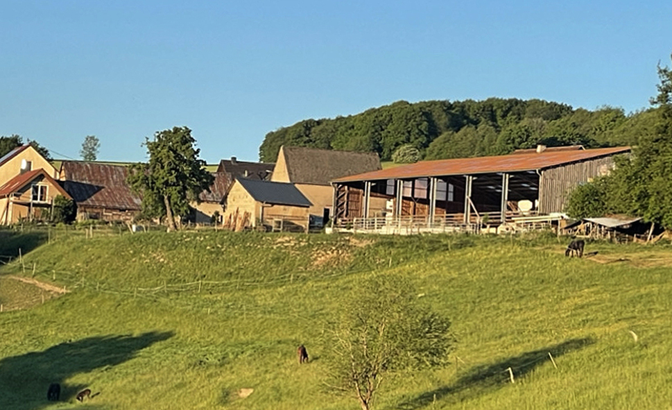 Blick auf die Gestüts-Anlage mit angrenzender Weide.