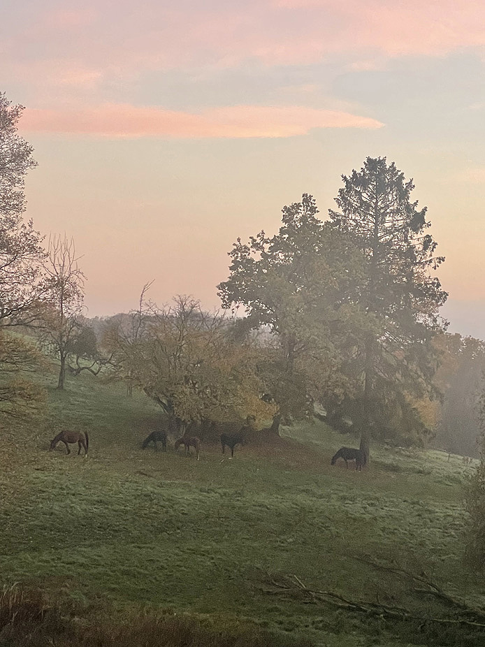 Nach der Aufregung am Vortag, genossen die Pferde einen ruhigen Herbstmorgen auf der großen Weide.