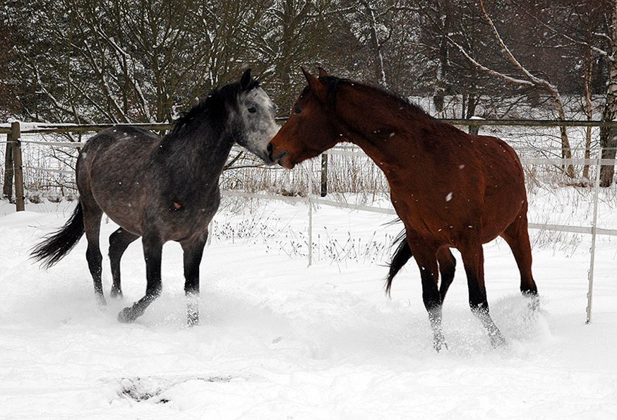 Vorn im Bild ein brauner Siglavy Bagdady Wallach, dahinter ein Dahoman Schimmel.