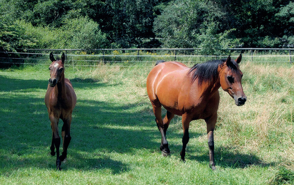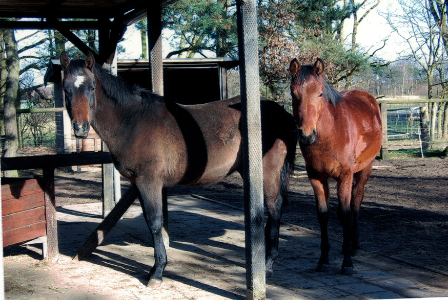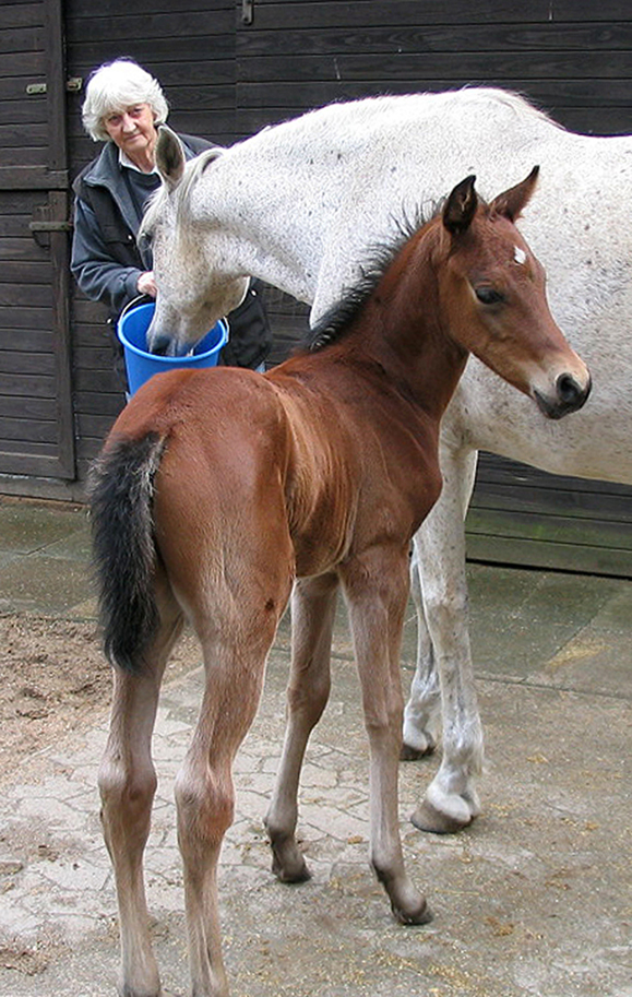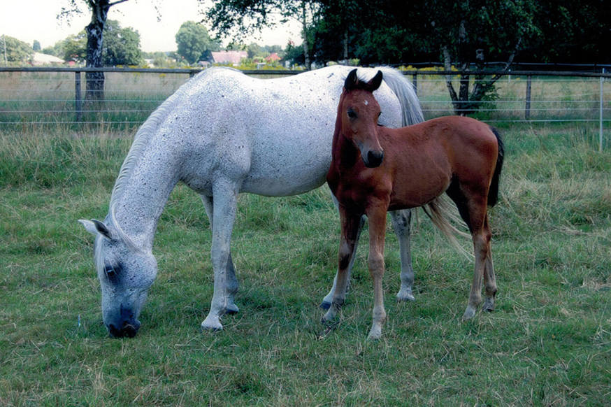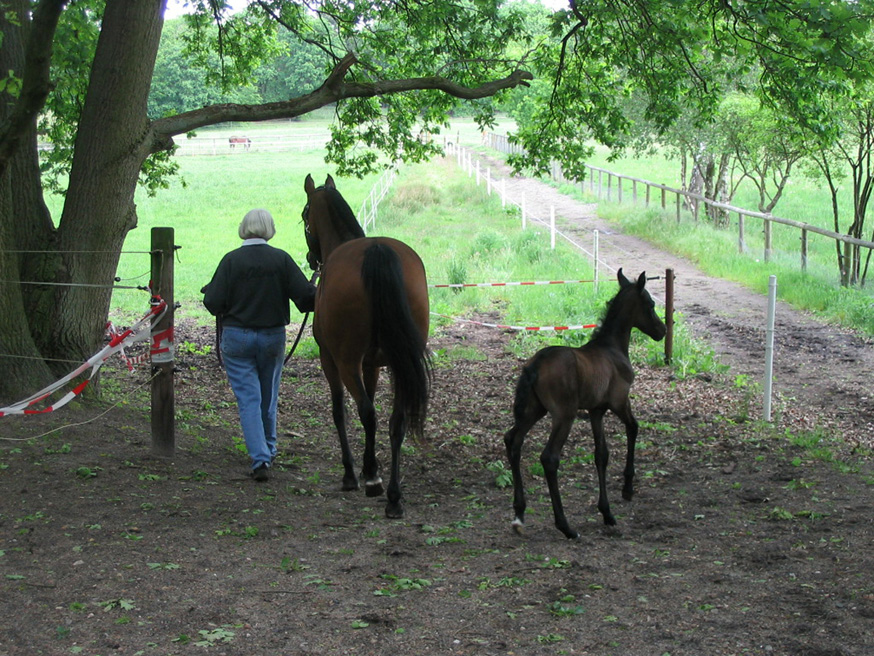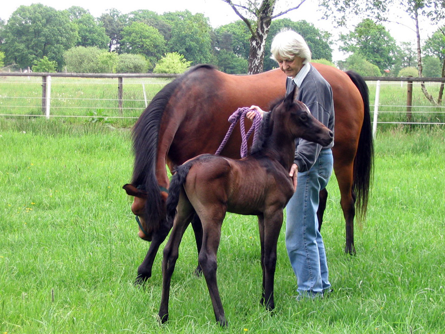 Ganz bewusst sollte die Stute Szellö (Dahoman XXXVI-8) geb. 1990 v. Dahoman XXXVI ein letztes Mal gedeckt werden. Der Vater von Szellö war Dahoman XXXVI, bei Szellös Mutter war der Vater Dahoman XXXI . Daher suchte ich nach einem Hengst, der hier den Anschluss herstellen konnte. In Kabu Kahn v. Kublai Khan war in der Abstammung auf der Mutterseite mit Dahoman XXXIX-10 der Stamm wieder vertreten. Die zweite Stute Alethea geb. 1996 v. Shogun III wurde vom Elite-Hengst Shaman v. Pamino gedeckt. Da es die letzten von mir gezogenen Fohlen sein sollten, wurde mit großer Spannung auf die Fohlen gewartet.