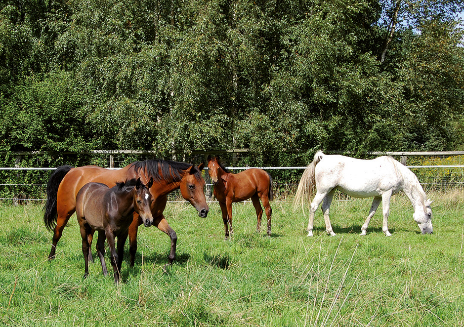 Nach den ersten zwei Wochen sind die Hengstfohlen Aramis und Gazlan zusammen mit den Müttern auf der Weide.