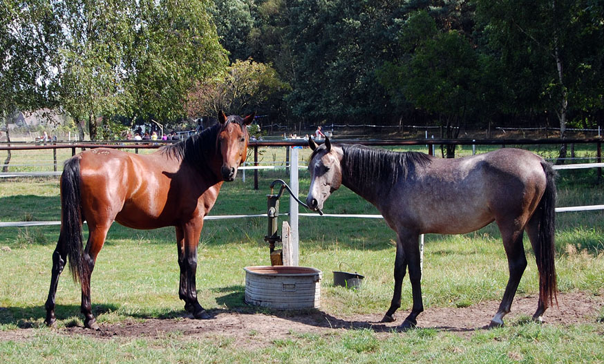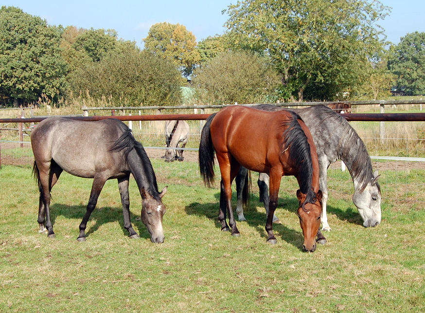 Aramis, Gazlan ( Mitte) daneben sein älterer Halbbruder Merino, der von der Ausbildung zurück gekommen war, im Sommer zusammen auf der Weide.