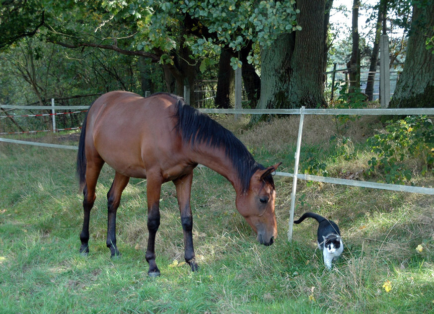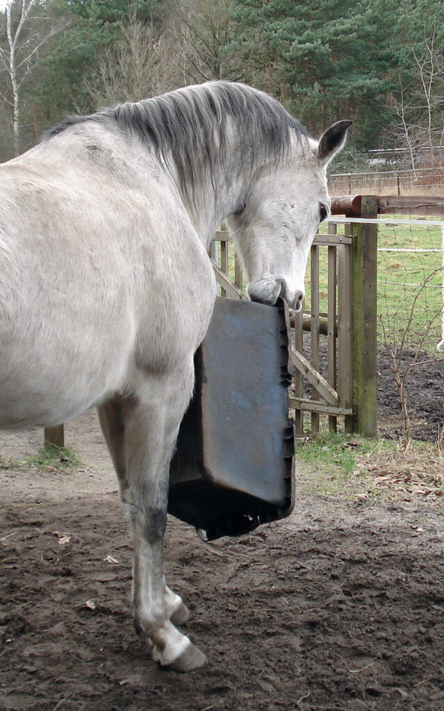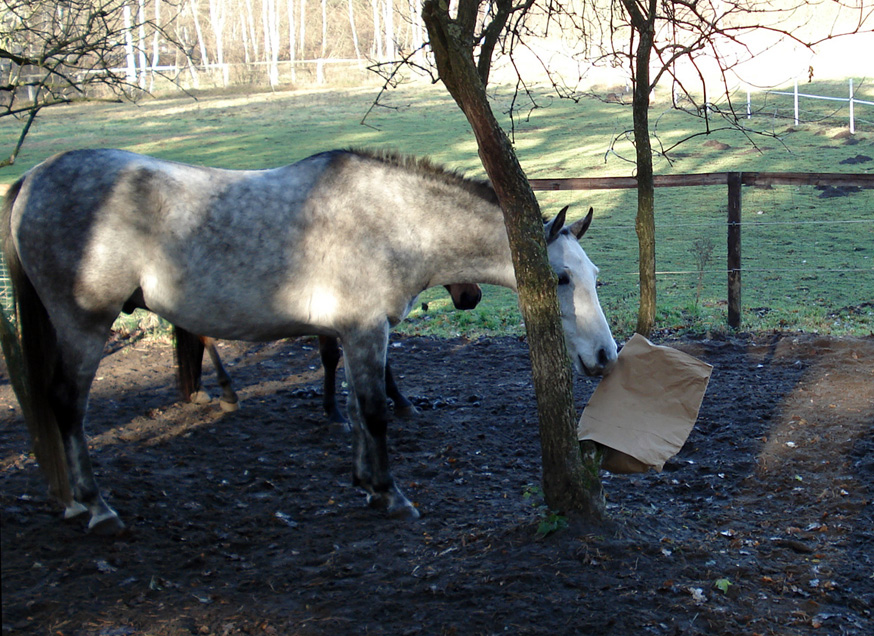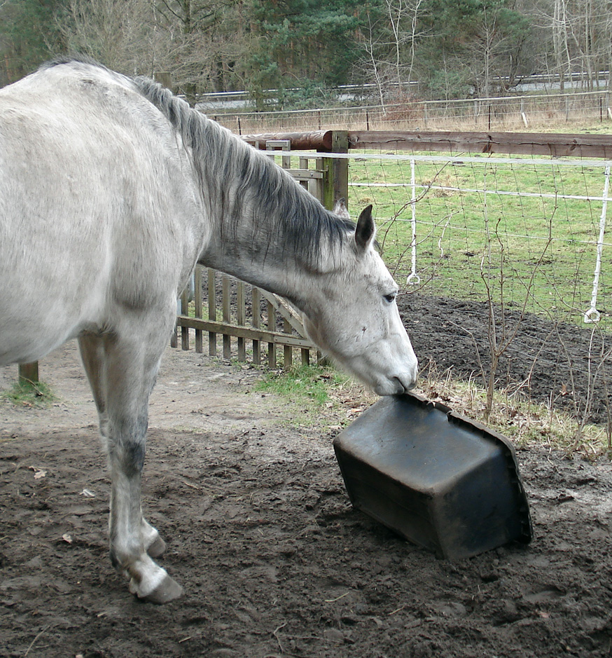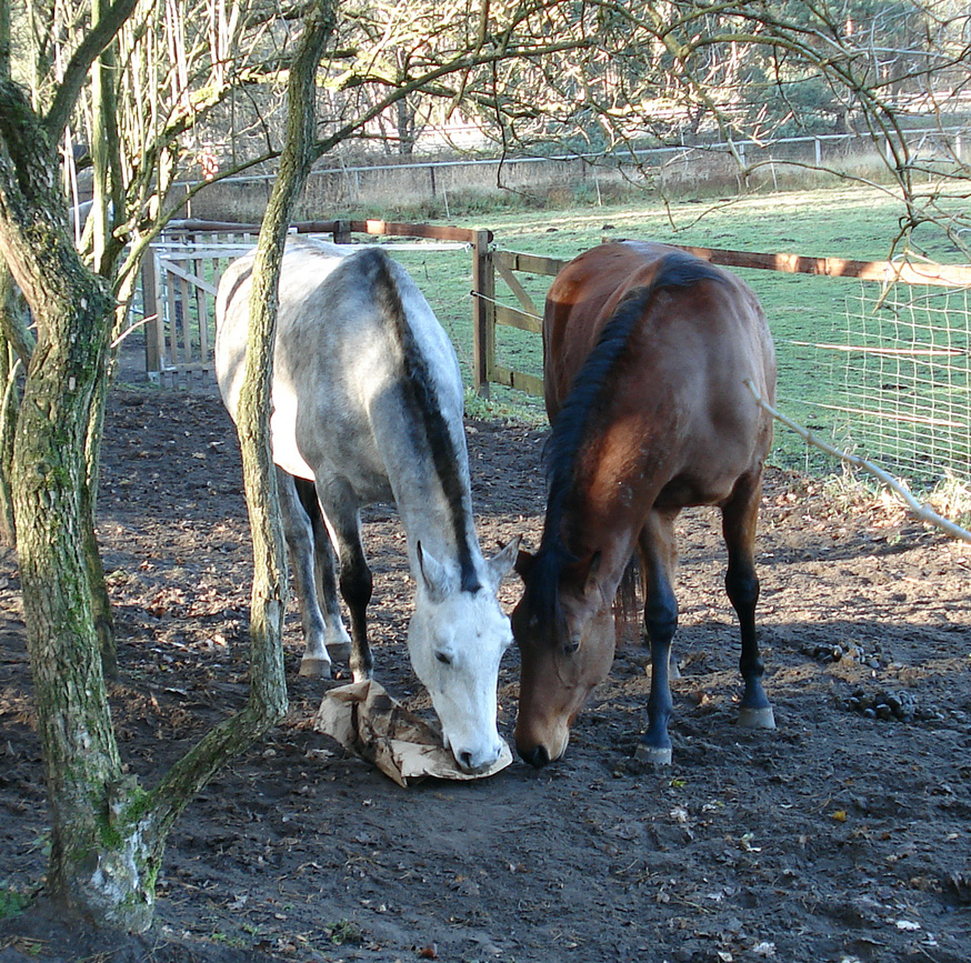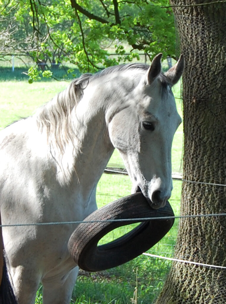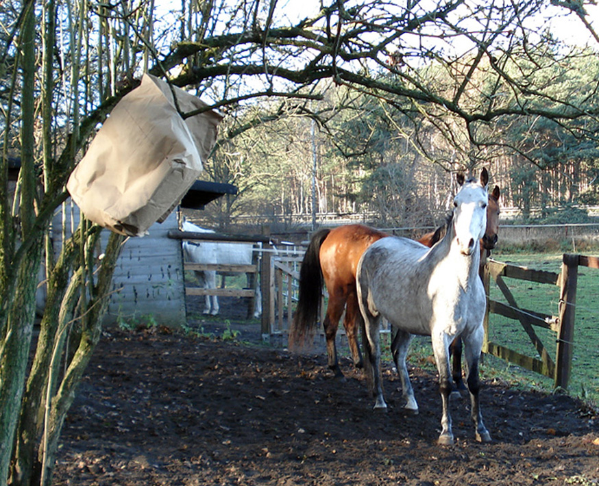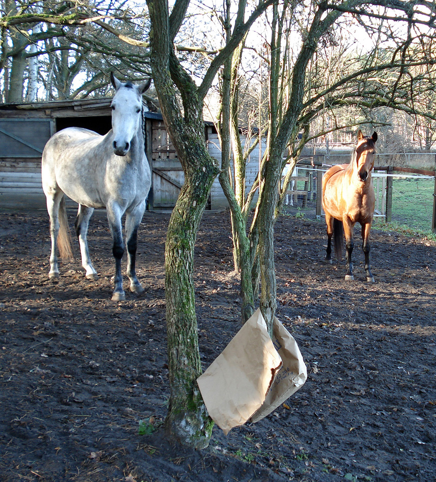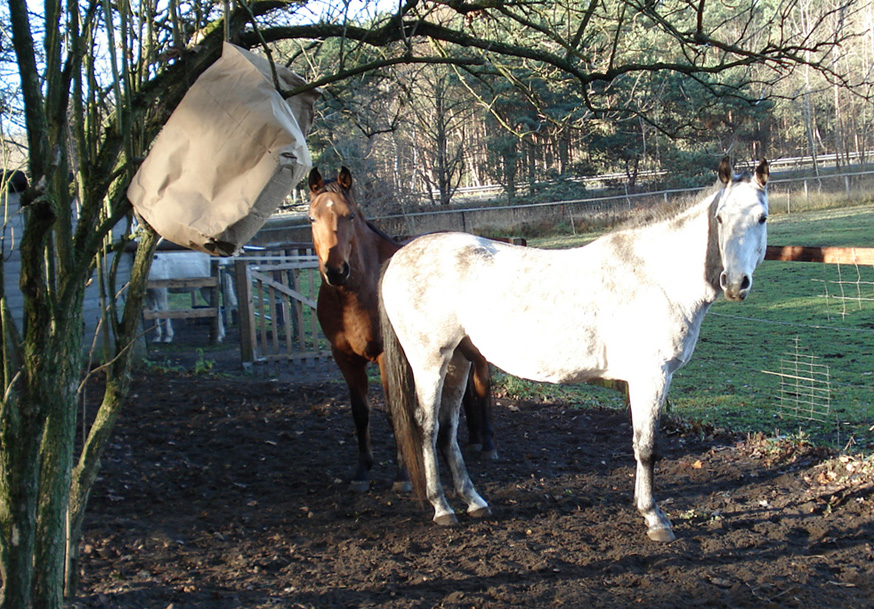 AlsAramis und Gazlan dann fast vier Jahre alt waren, tauchten immer mal merkwürdige Dinge auf ihrem Auslauf auf. So lernten sie, sich Neuen anzunähern und damit umzugehen.