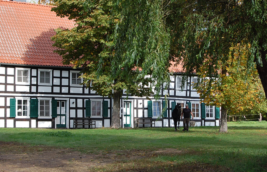 Das Gestütshaus ist ein wunderschönes Fachwerkhaus unter alten Bäumen.