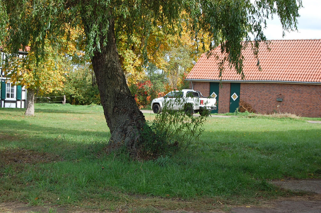Zwischen Haus und einem weiteren Stallgebäude befindet sich ein Vorplatz, auf dem ein wundervoller alter Baum steht.