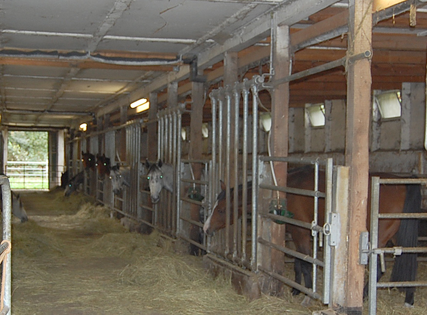 Der große Stall mit Boxen an beiden Seiten.