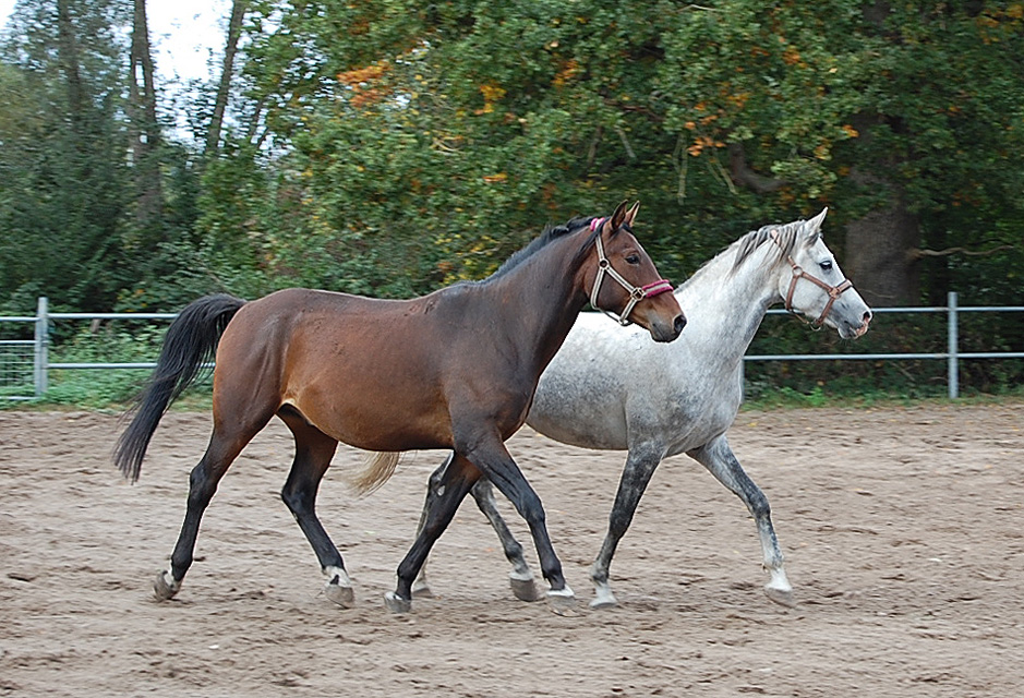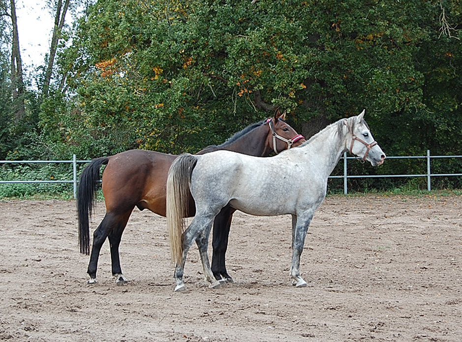 Vorn im Bild ein brauner Siglavy Bagdady Wallach, dahinter ein Dahoman Schimmel.