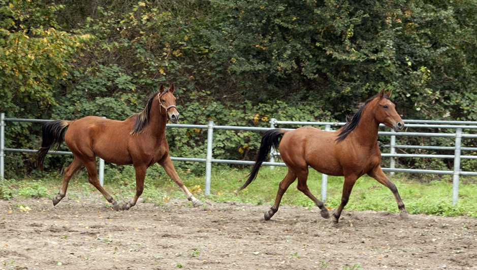 Zwei Koheilan-Wallache, der braune von ist 4 Jahre alt, dahinter der hellbraune 3 Jahre. Beide haben besonders gute Gänge.