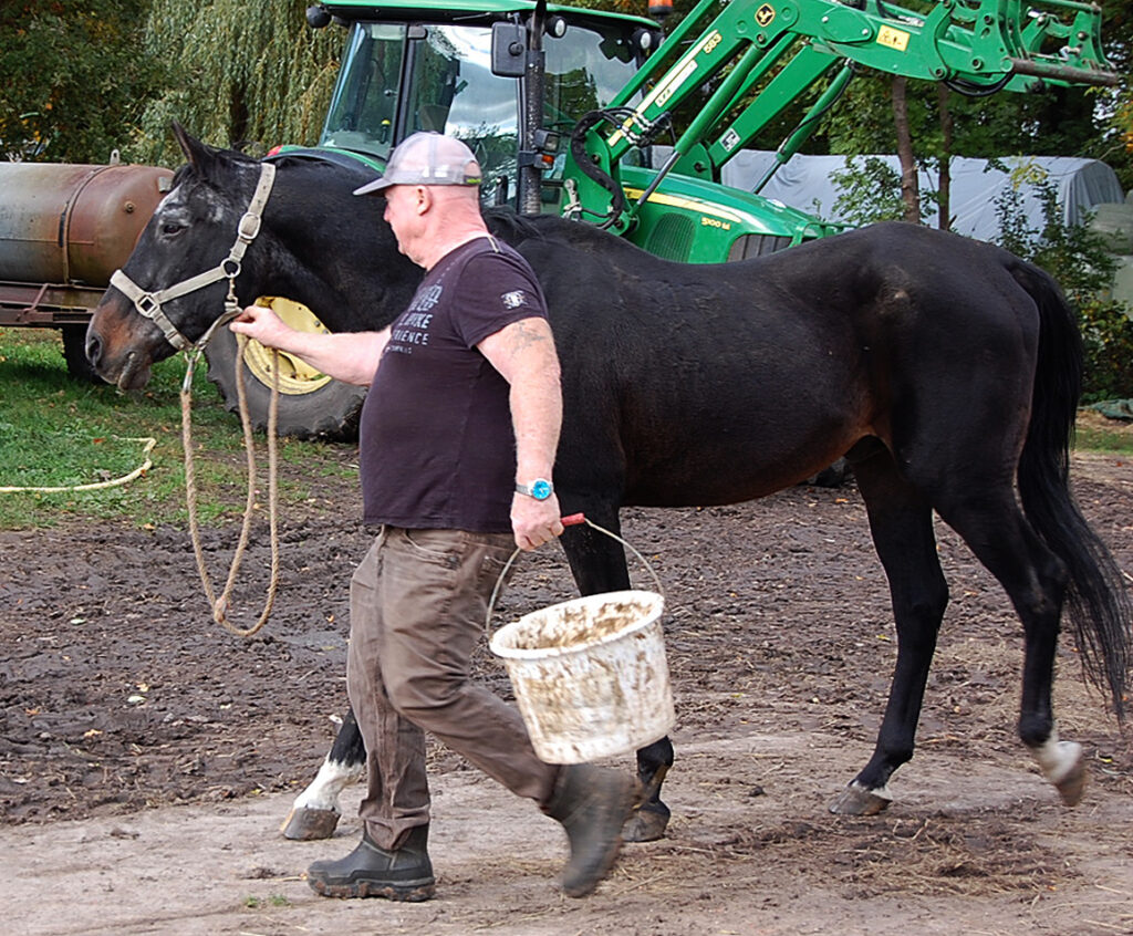 Der 34-jährige Muzulman (Mersuch XIX-68) wird in den Stall geholt. Alt, aber hellwach und klar auf den Beinen. Zur Freude von seinem Besitzer.
