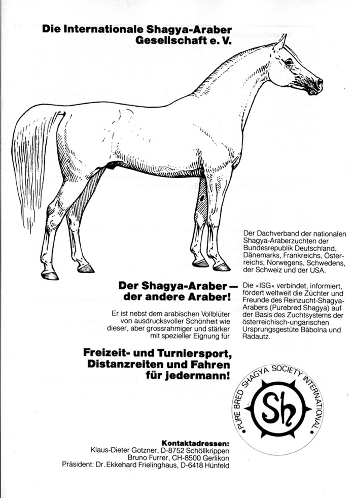 Man hatte jetzt die ISG und erhoffte sich davon eine größere Aufmerksamkeit für diese alte Rasse »Halbblut-Araber« die jetzt in »Shagya-Araber« umbenannt war und eine Anerkennung bei der WAHO erhalten hatte.